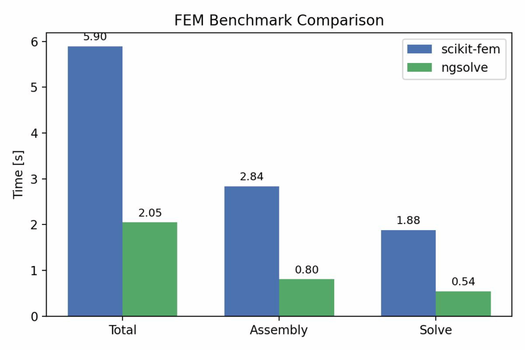 Pure-Python scikit-fem is highly flexible, stable, and very easy to work with. On the other hand, it may have limitations in terms of computation time. NGSolve, in contrast, is a library whose backend runs in C++, so it is expected to be faster. Its native implementation is also highly flexible. Therefore, we decided to compare the computation time and implementation characteristics of the two.