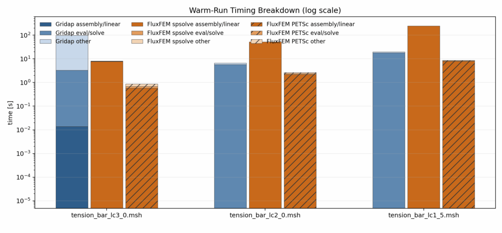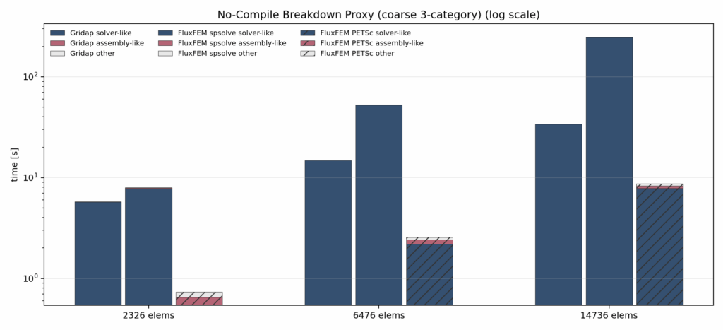 This result is also important for clarifying the deeper difference between Gridap and FluxFEM. Gridap not only reuses cold-start compilation effectively, but also shows consistently strong steady-state total runtime. FluxFEM, by contrast, changes character significantly depending on the solver backend. With spsolve, it appears clearly disadvantaged as a forward-solve engine, whereas with PETSc it improves to a level that is no longer catastrophically worse in practical terms. For that reason, the value of FluxFEM should not be judged only by total warm-run time; it must also be evaluated in terms of which backend produces that cost, and how the system supports a broader AD-enabled research workflow.