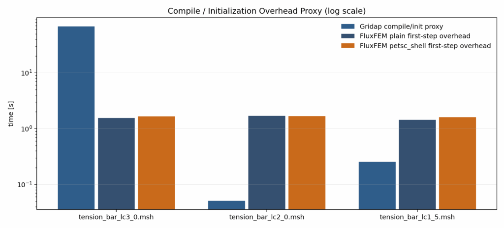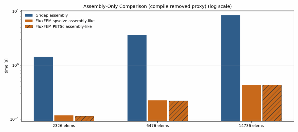 overhead becomes much smaller in subsequent runs. This reduction occurs because the first solve! triggers Julia method specialization and JIT compilation across the nonlinear solver stack, element integration, assembly, and the linear-solver path, and the resulting compiled code is retained within the same session. Therefore, Gridap’s advantage is not that compilation is always cheap, but that the large initial JIT cost can be reused very effectively once it has been paid. By contrast, the corresponding proxy remains relatively small for FluxFEM across all tested meshes, indicating that FluxFEM’s main limitation is not pure compilation cost itself but the cost structure that remains in steady-state execution. This bar plot focuses on assembly-oriented runtime after removing as much first-run compile-related overhead as possible. It shows that Gridap’s overall warm-run advantage should not be interpreted simply as overwhelming superiority in steady-state assembly cost alone. Once compile-like effects are reduced, the remaining assembly-oriented cost does not always separate Gridap and FluxFEM by a large margin. This suggests that Gridap’s strong same-session behavior is driven not only by runtime efficiency but also by very effective reuse of the initial compilation cost. At the same time, this comparison should be read as a diagnostic approximation rather than a perfectly matched assembly-time measurement, since the assembly-oriented terms are defined differently on the two sides. Even so, the result makes clear that FluxFEM’s disadvantage cannot be reduced to “slow Python/JAX assembly,” and that the solver backend and the broader steady-state runtime structure must be considered separately.