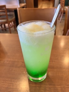 A Japanese cream soda is a classic dessert drink made with bright green melon-flavored soda topped with a scoop of vanilla ice cream and often a maraschino cherry. Despite the name, the drink does not taste exactly like real melon; the flavor comes from a sweet artificial syrup that became popular in Japan. It is usually served in a tall glass, creating a layered look with fizzy soda at the bottom and melting ice cream on top. In Japan, cream sodas are commonly found in traditional cafés known as kissaten, as well as retro-style coffee shops and casual restaurants. The price is typically around 500–800 yen depending on the café and location.